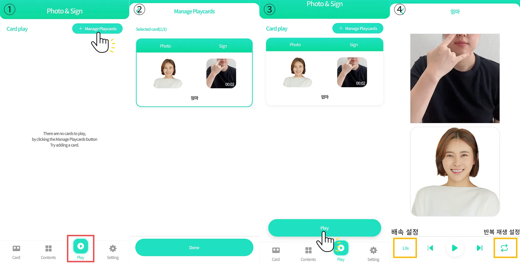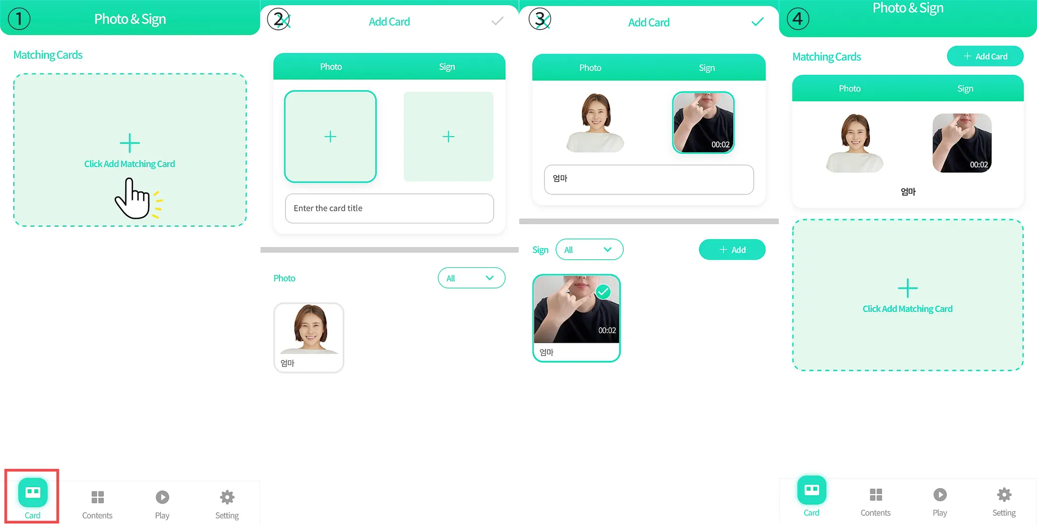 ex) ‘엄마’ 개인 맞춤형 이미지 (Photo) & ‘엄마’ 대체의사소통 수단 수어 (Sign)hoto & sign video matching card