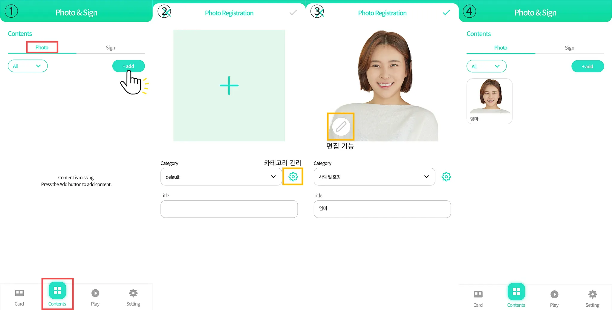 ② 등록되어있는 컨텐츠들 중 매칭되는 Photo와 Sign을 선택해줍니다.