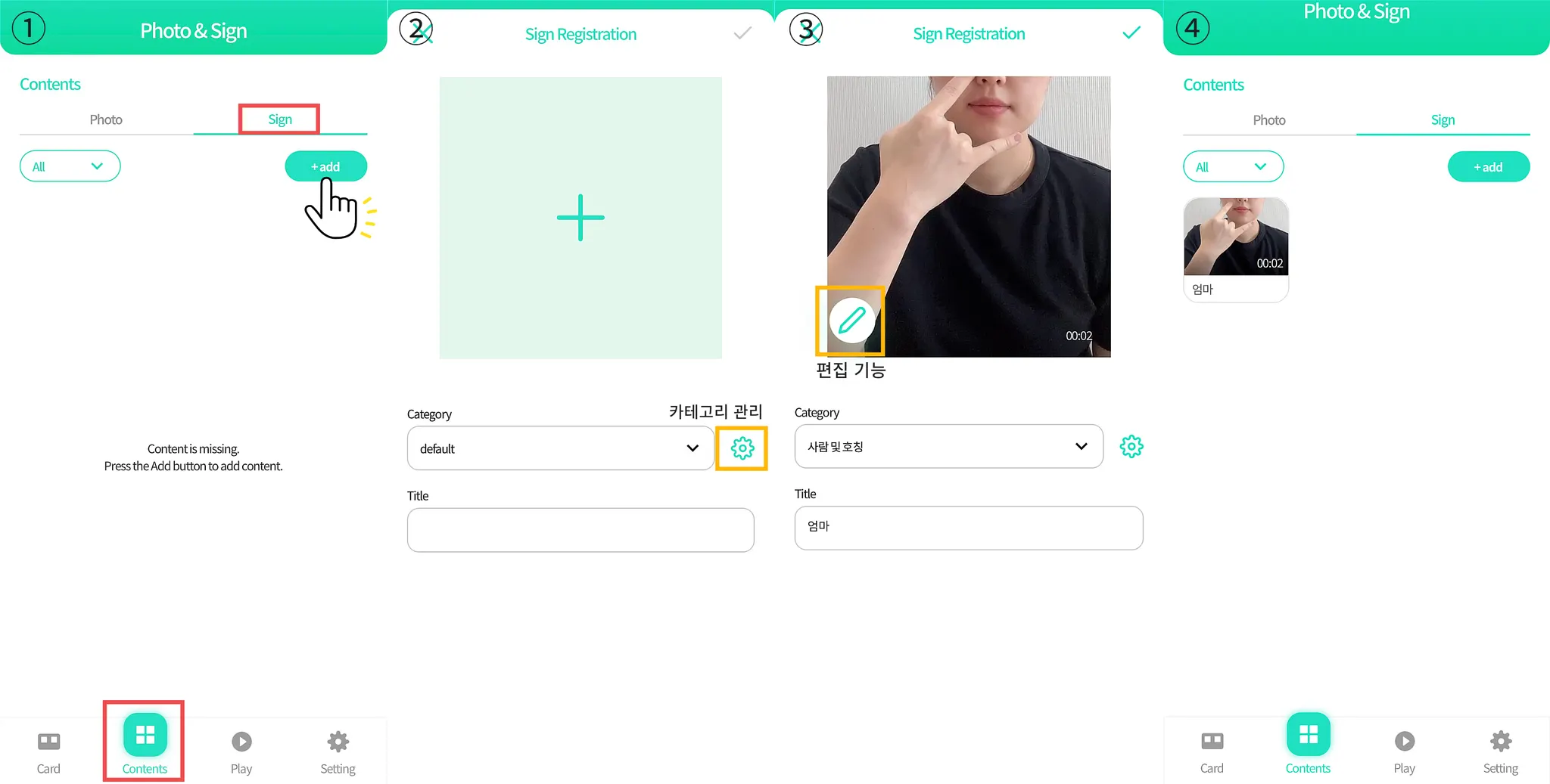 ③ 수어 영상을 추가하고 카테고리와 제목을 설정한 후 우측 상단